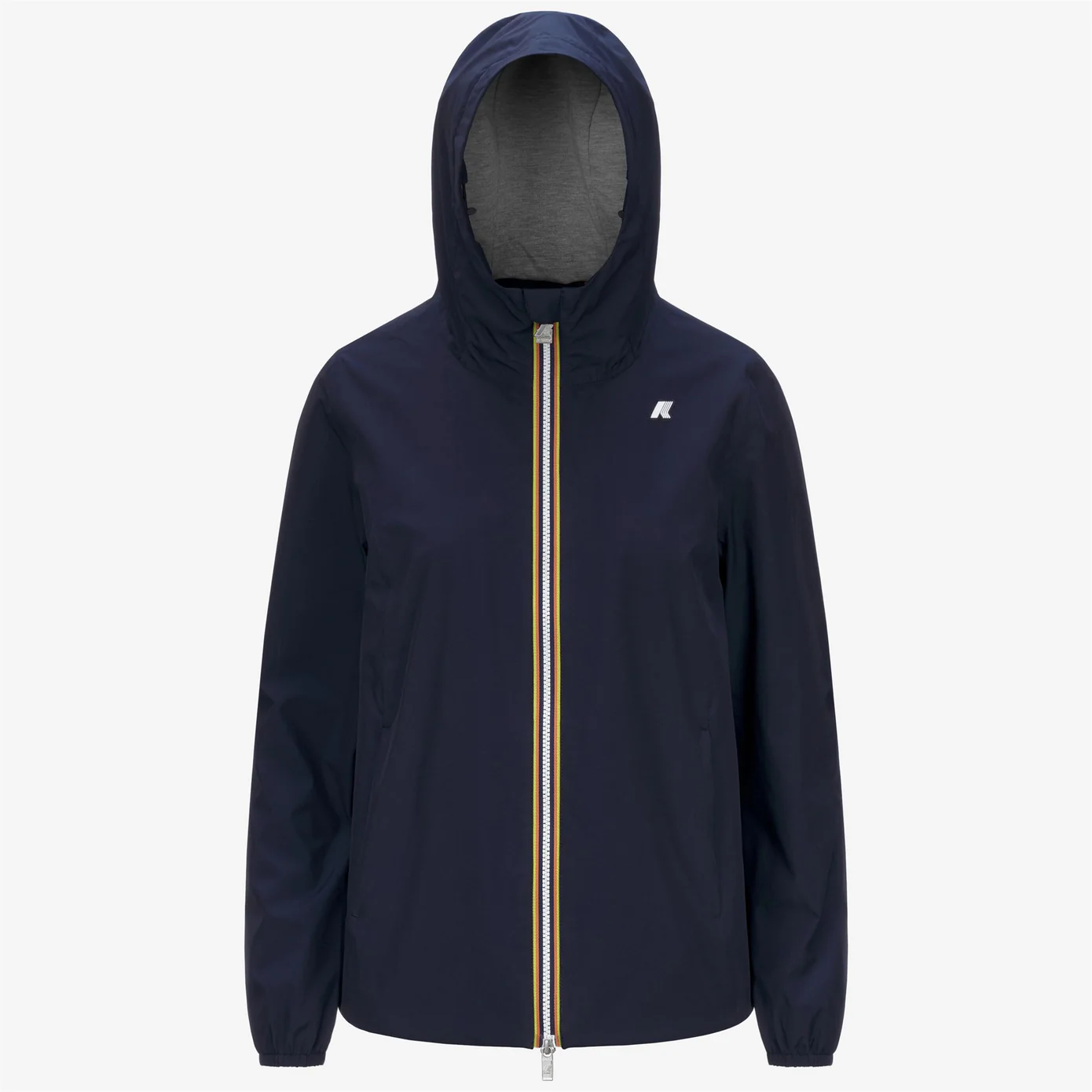 Marguerite è una giacca corta da donna che offre un grado di calore medio, ideale per la mezza stagione. Il modello ha un look casual e moderno, è realizzato in poliestere stretch con spalmatura impermeabile e antivento e ha una fodera interna in morbido jersey di cotone grigio melange. Le cuciture interne sono termonastrate e il punto vita è decorato con liconico tape multicolor K-Way per una nota distintiva e di carattere.