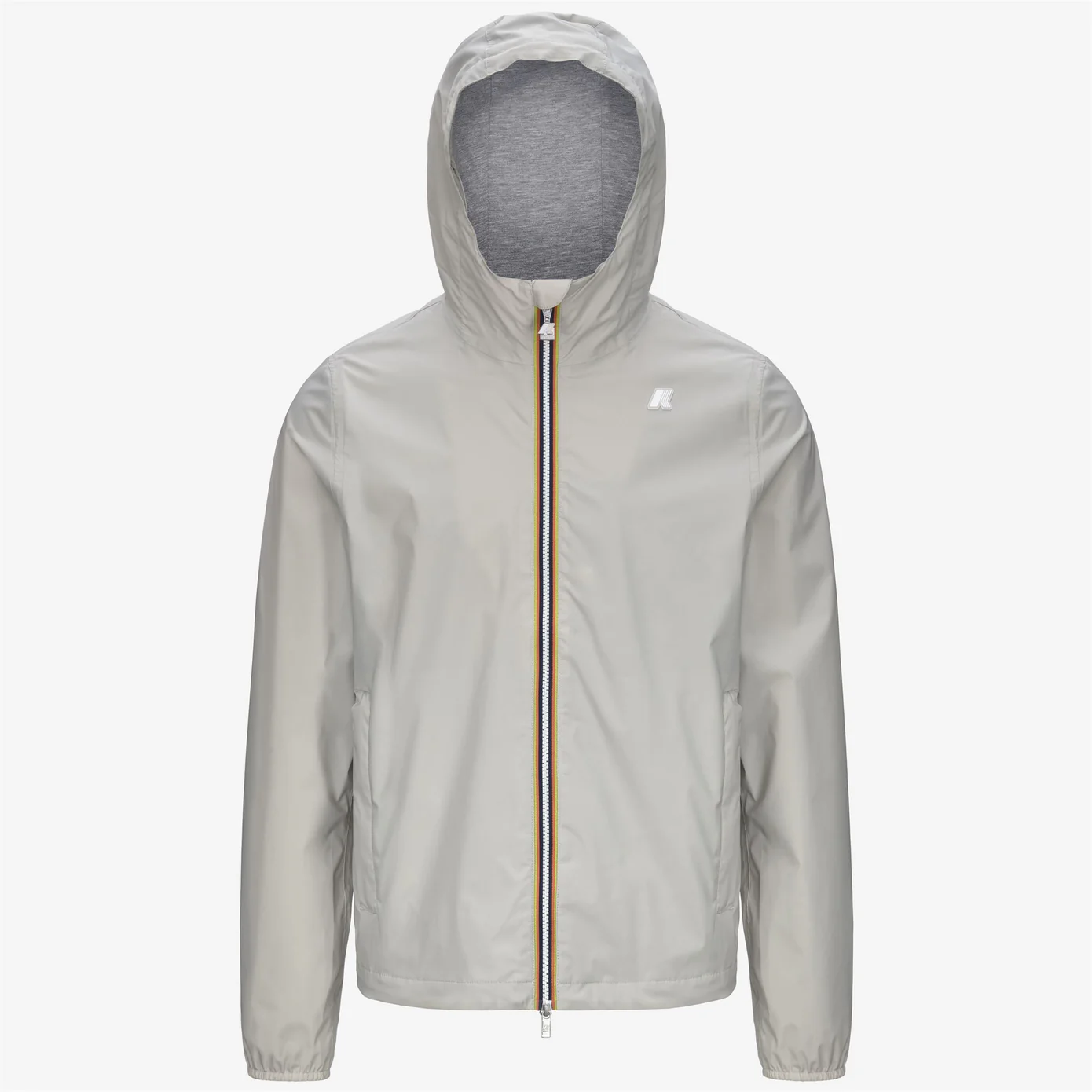 Jack è una giacca da uomo con vestibilità slim, realizzata in nylon stretch resistente agli agenti atmosferici e rifinita con una fodera in morbido jersey di cotone grigio melange applicata solo su fronte e retro, per garantire comfort superiore e una piacevole sensazione a contatto con la pelle. Linterno è curato nei dettagli con cuciture termonastrate e liconico tape multicolor K-Way applicato al punto vita, che aggiunge una nota distintiva al design.
