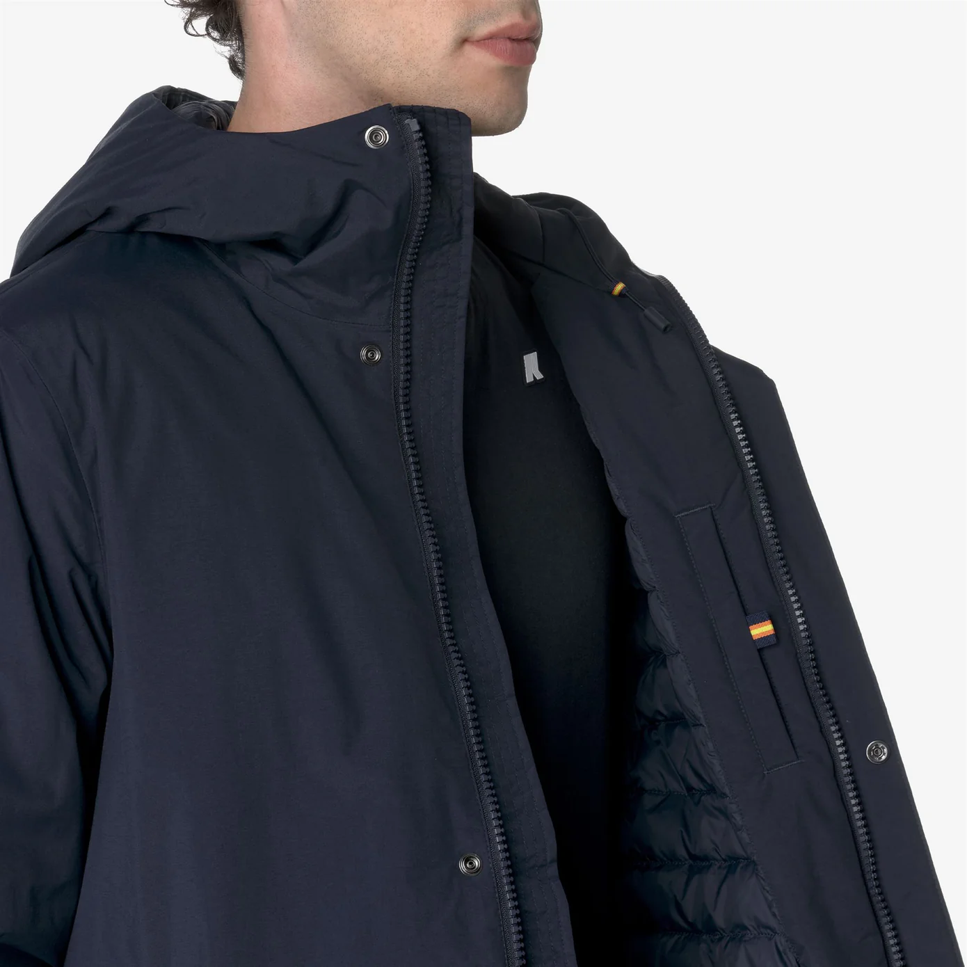 La giacca lunga da uomo Thomas è progettata per la mezza stagione perchè combina l'esterno in nylon ottoman dalla mano fresca e croccante con l'imbottitura mista in piuma e poliestere e la fodera in nylon riciclato che rispettano l'ambiente. All'interno il capo svela una rifinitura curata in ogni dettaglio con trapuntatura a righe orizzontali nella parte alta e il nastro multicolor K-Way al centro per un accento distintivo e deciso.